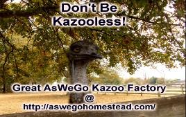 All content is © by their respective © holders. AsWeGoHomestead.com and entire site © AsWeGo Homestead 2007/2012 All Rights Reserved. If you are the original creator of material featured on this website and want it removed, please contact the The Old Kazoo Maker. |